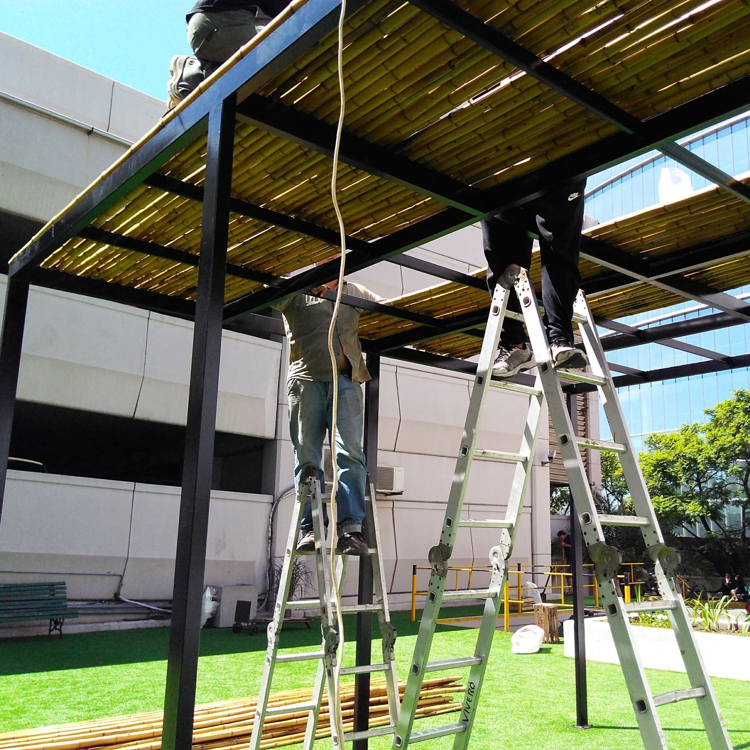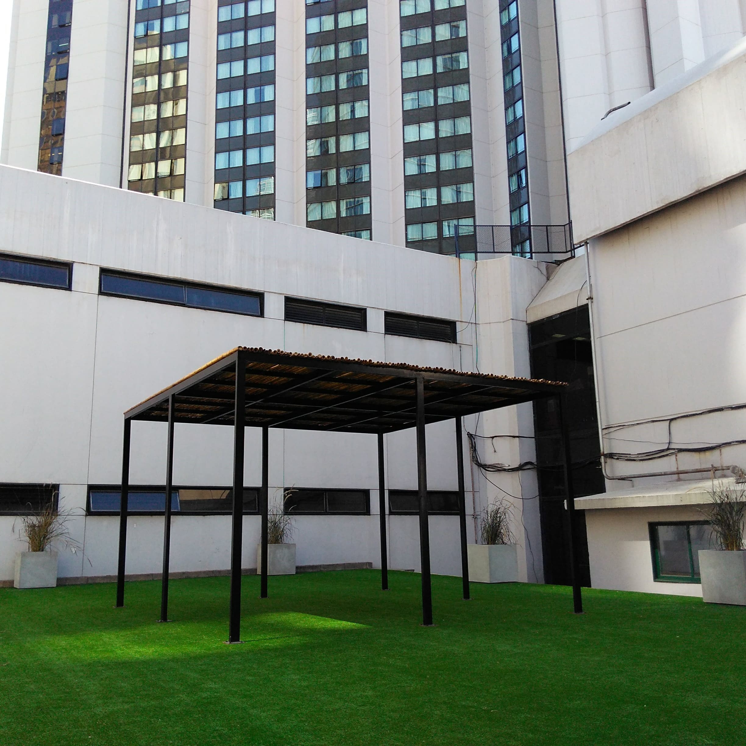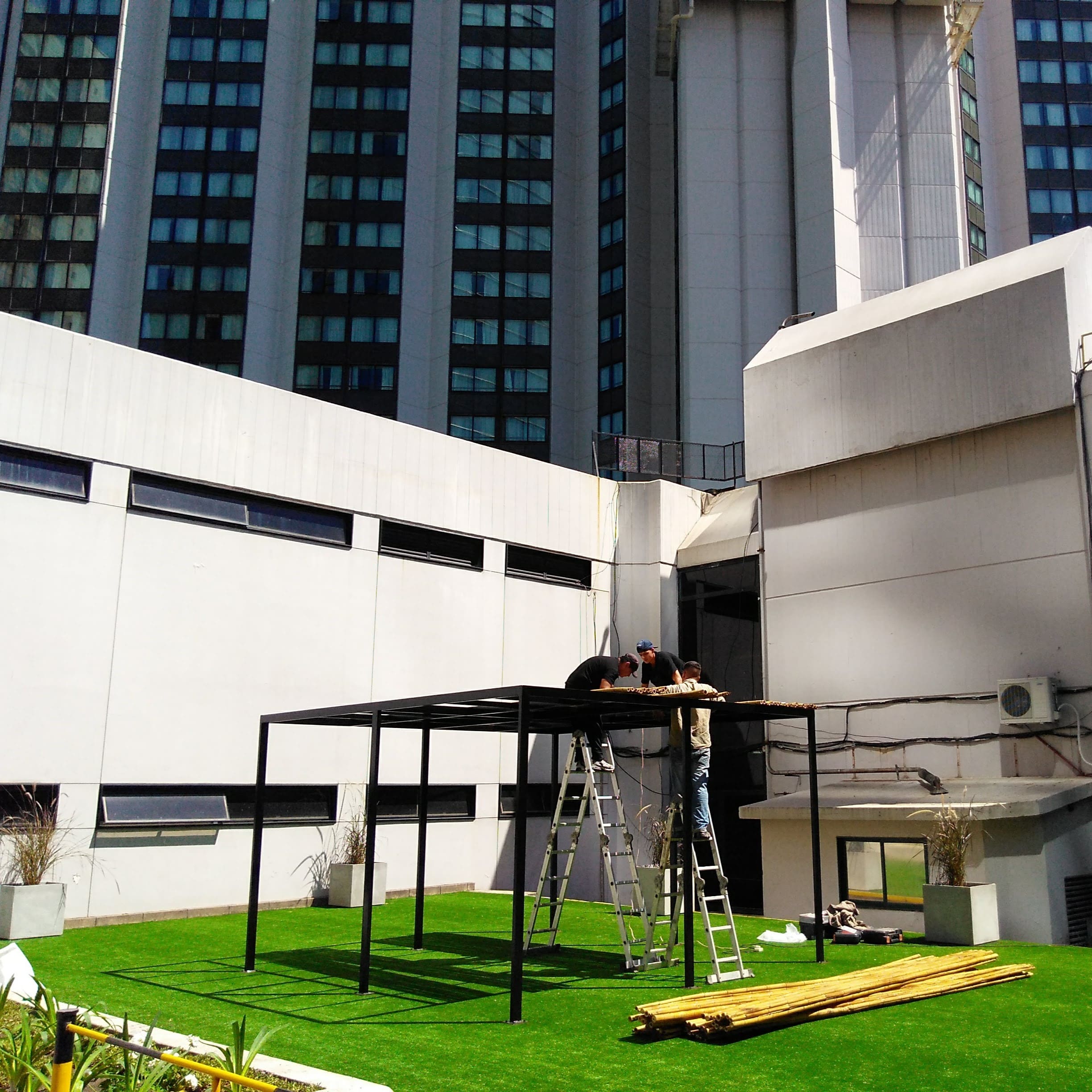 Nuestro cliente nos encomendó realizar en la terraza del Sheraton Buenos Aires, ubicado en la zona de Retiro, una pérgola para descanso del personal. Se confeccionó una estructura de hierro, se colocó cesped sintético, y se techo la pérgola con paneles de cañas flameadas.